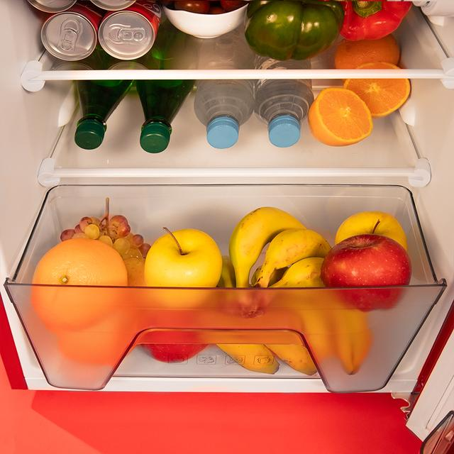 Bolero CoolMarket 2D Origin 86 Red E Mini frigorífico retro de dos puertas rojo de 89,3cm de alto y 48,7 de ancho con capacidad de 86L, clase energética E, LED interior y tirador cromado.