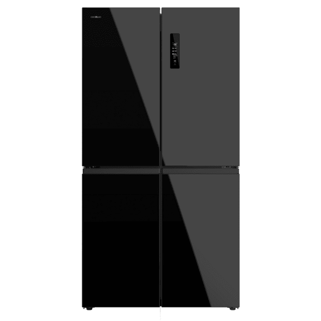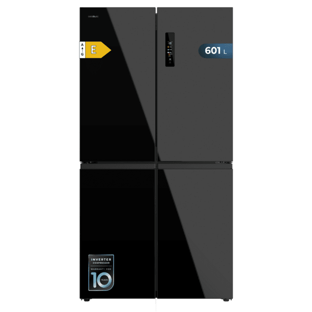 Bolero CoolMarket 4D 601 Black Glass E Frigorífico de 4 Puertas cristal negro, Capacidad de 601 Litros, Ancho de 90.5 cm alto de 177.5 cm, Sistema de conservación Total NoFrost, MetalFlex Cooling, Cajón Control de Humedad y Cajón temp. variable 0ºC A 7ºC, Motor Inverter Plus silencioso y de bajo consumo, Display digital exterior, Clasificación energética Clase E, Funciones Fast Cooling y Fast Freezing, Alarma de puerta Abierta y Alarma temperatura y mal funcionamiento, Modo ECO